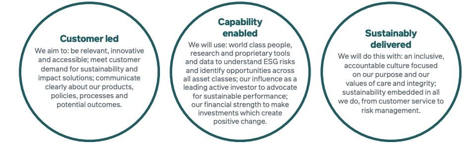 While our responsibilities and obligations in each of these three roles may differ, as we discuss below, our approach in all three is united by a common set of principles and ambitions, set out in the box at the bottom of the page.We also have the important responsibility of deciding the financial outcomes we want our asset managers to deliver for us, and the sustainability considerations we require them to apply.